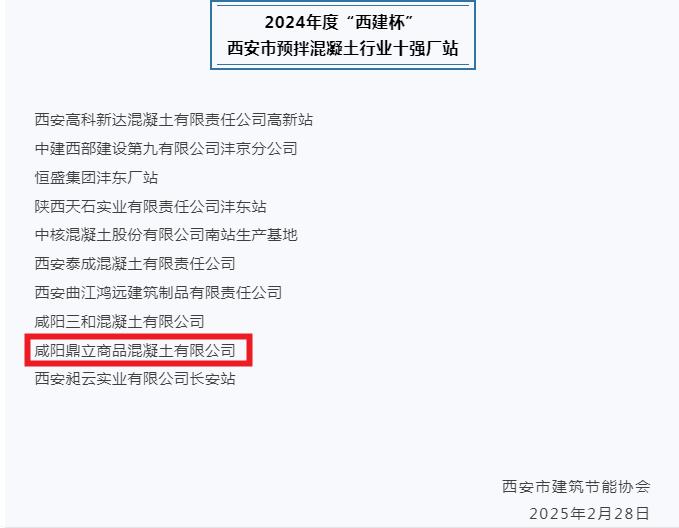 祝賀我公司榮獲2024年度“西建杯” 西安市預(yù)拌混凝土行業(yè)十強廠站榮譽稱號